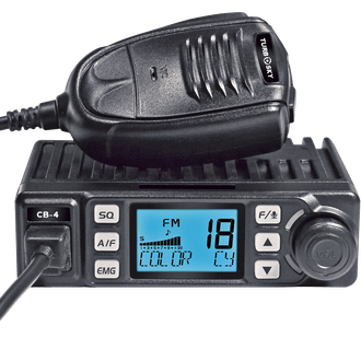 Turbosky CB-4 - мобильная радиостанция СИ-БИ диапазона, работающая в частотах 26,965 - 27,410 МГц, имеющая в комплекте тангенту, провода для подключения и запчасти для крепления.