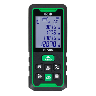 Лазерный дальномер RGK DL50G - зеленый луч служит для измерения расстояний, длин, высот, площадей и объемов. Главное преимущество - яркий зеленый луч, который гораздо лучше красного видно при ярком солнечном свете, например, при работе на улице или в просторных помещениях - ангарах, складах и т.д.